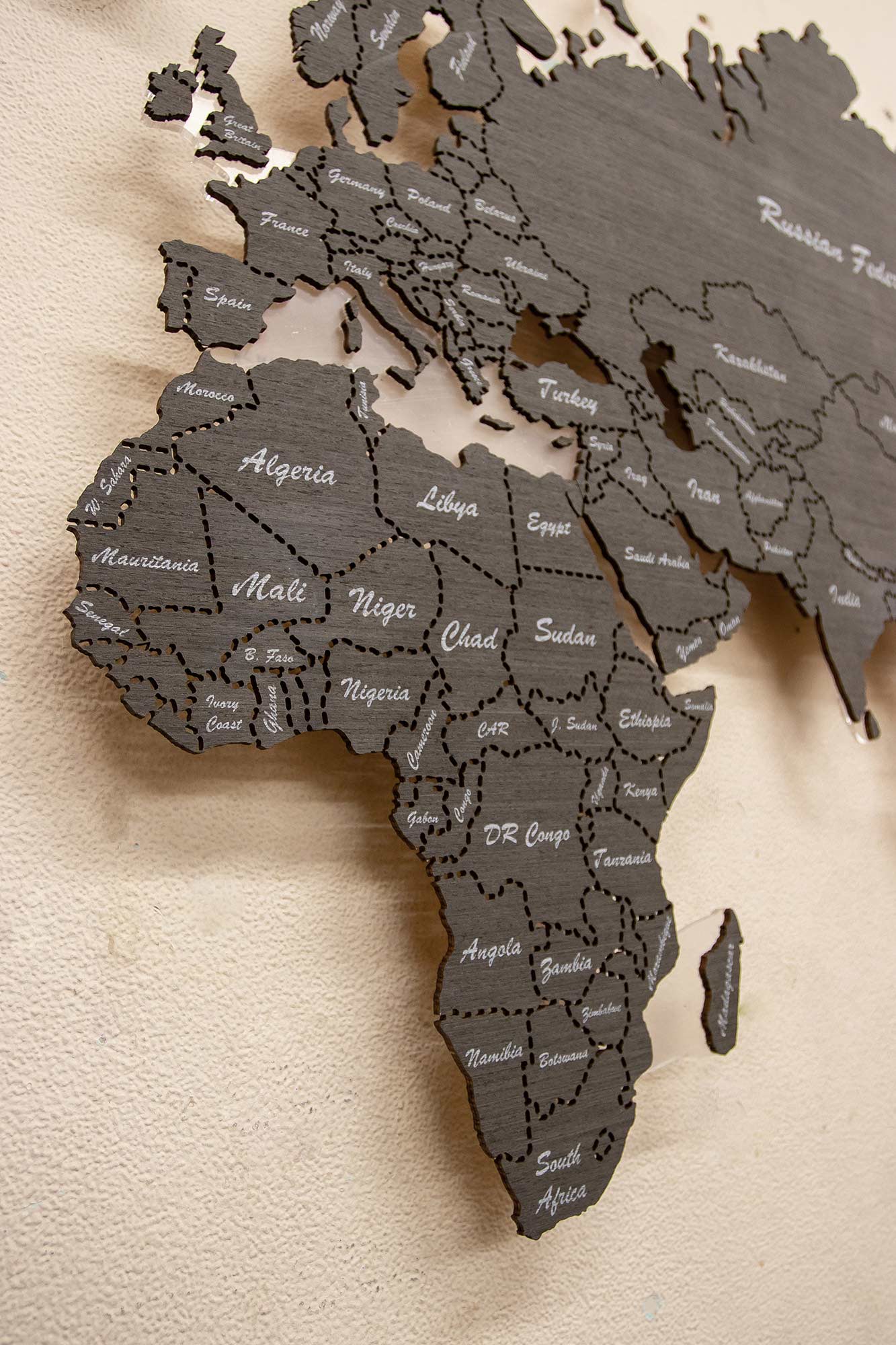 Карта мира с УФ-печатью названий основных государств (на английском) и штриховым зазором для выделения подсветкой границ государств. Отделка из шпона Файн-Лайн Эбен115QM.